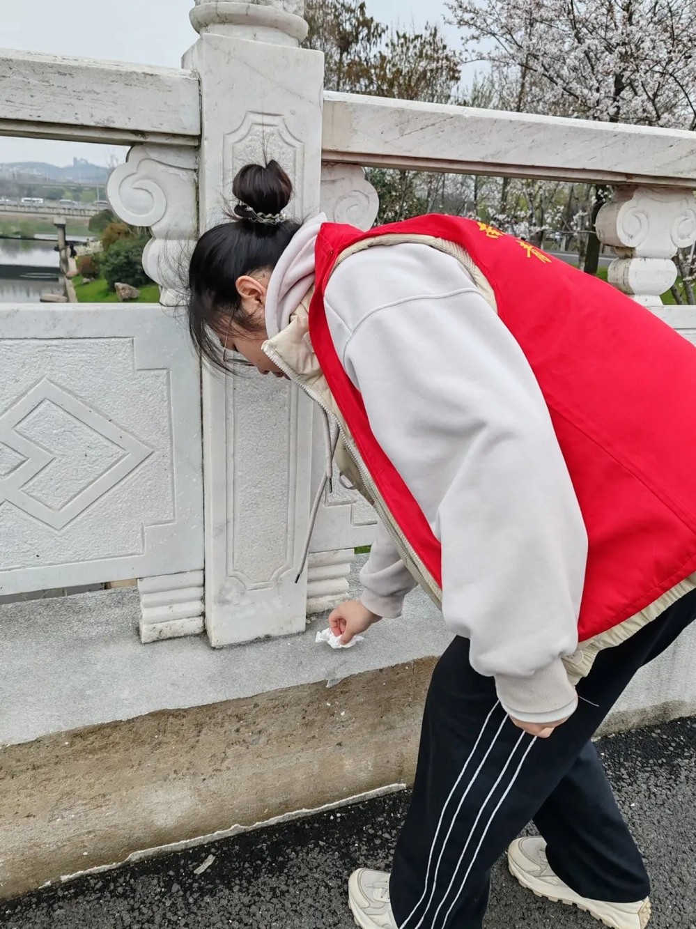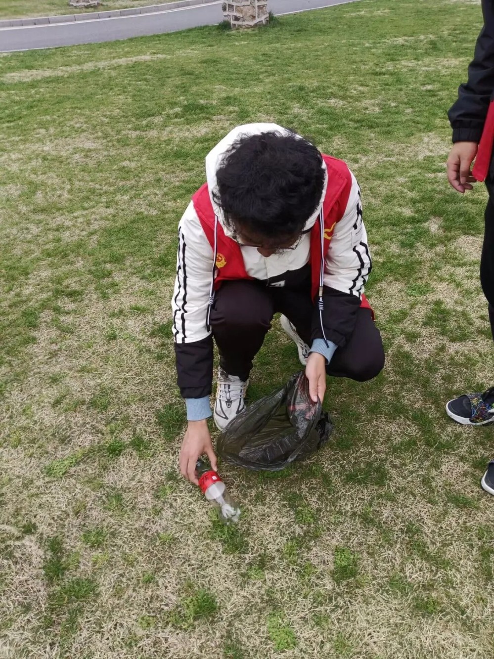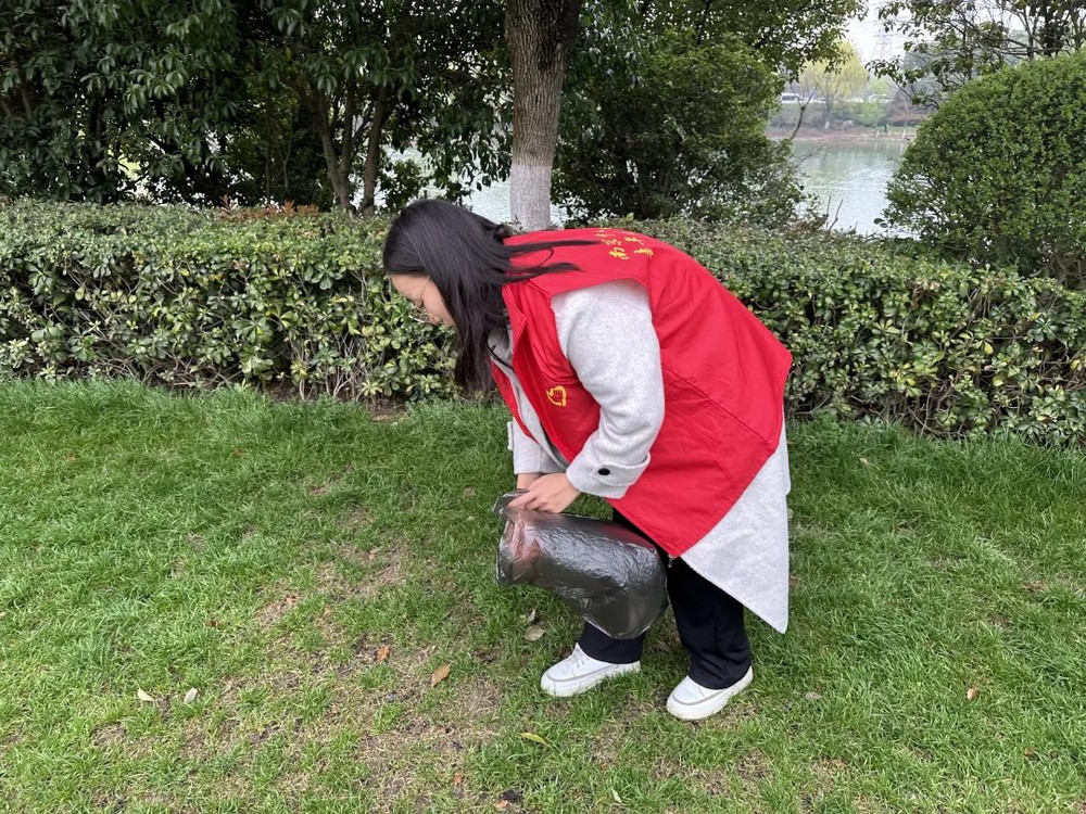 待人员悉数到齐后,团支书给大家发放了红马甲以及垃圾袋,随后同学们便三五成群开始了活动。有的小组前往草坪,捡拾乱扔的烟头以及野餐遗留下的塑料瓶,有的小组沿着绕湖大道前行,拾起纸团和塑料袋。