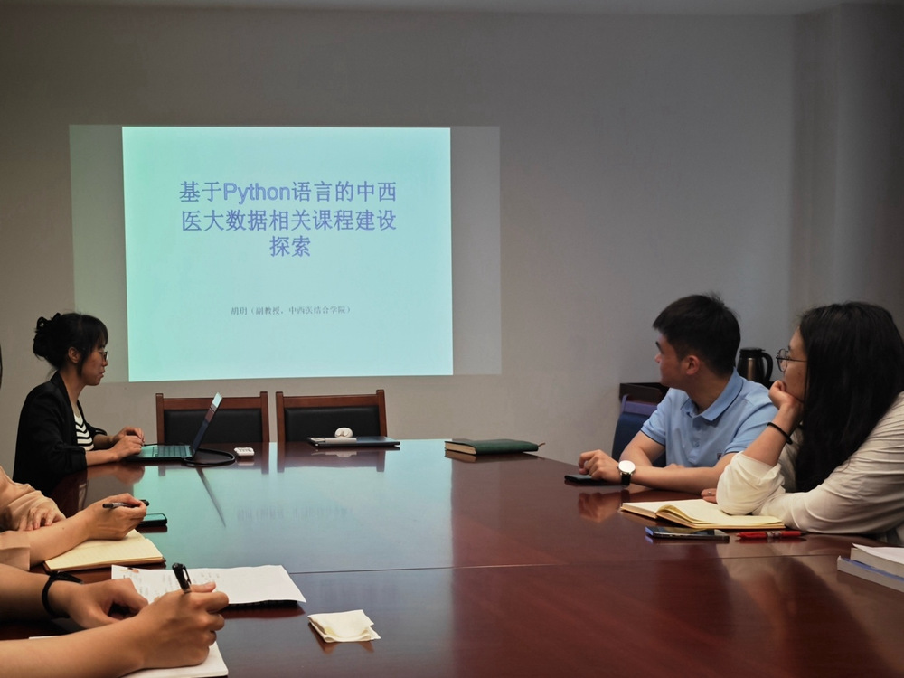 首先,胡玥老师从所负责的《实用中医药大数据研究导论》课程出发,介绍了课程的开课背景、开课情况、教学目标,课程和教材建设现状、评价考核情况以及员工对课程的教学反馈等内容,分享了基于Python语言的中西医大数据相关课程建设中的探索经验。在教学实践及课程建设中,胡玥老师发现本门课程存在授课内容与相关高阶课程如“医学统计学”衔接困难、员工反馈Python语言相关的授课内容难度较高、网络硬件问题限制选课人数等问题。针对上述问题,与会老师展开热烈讨论。老师们认为可以通过制作操作视频,帮助员工课下预习复习,提高学习效果;还可通过案例教学,讲解利用不同数据研究方法解决实际问题,提高授课效果。