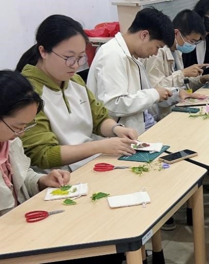 接着,本博班的同学结合专业特色,带领东南大学的伙伴们体验了一场妙趣横生的“敲拓染”中药香囊制作。中草药之形,可装点生活美韵;中草药之用,可护佑身体康健。从在布面上拓印出心中的画面,到亲手装填香囊芯。别开生面的中医药敲拓染体验让东南大学的同学们眼前一亮,这枚香囊会持续散发文化之香。