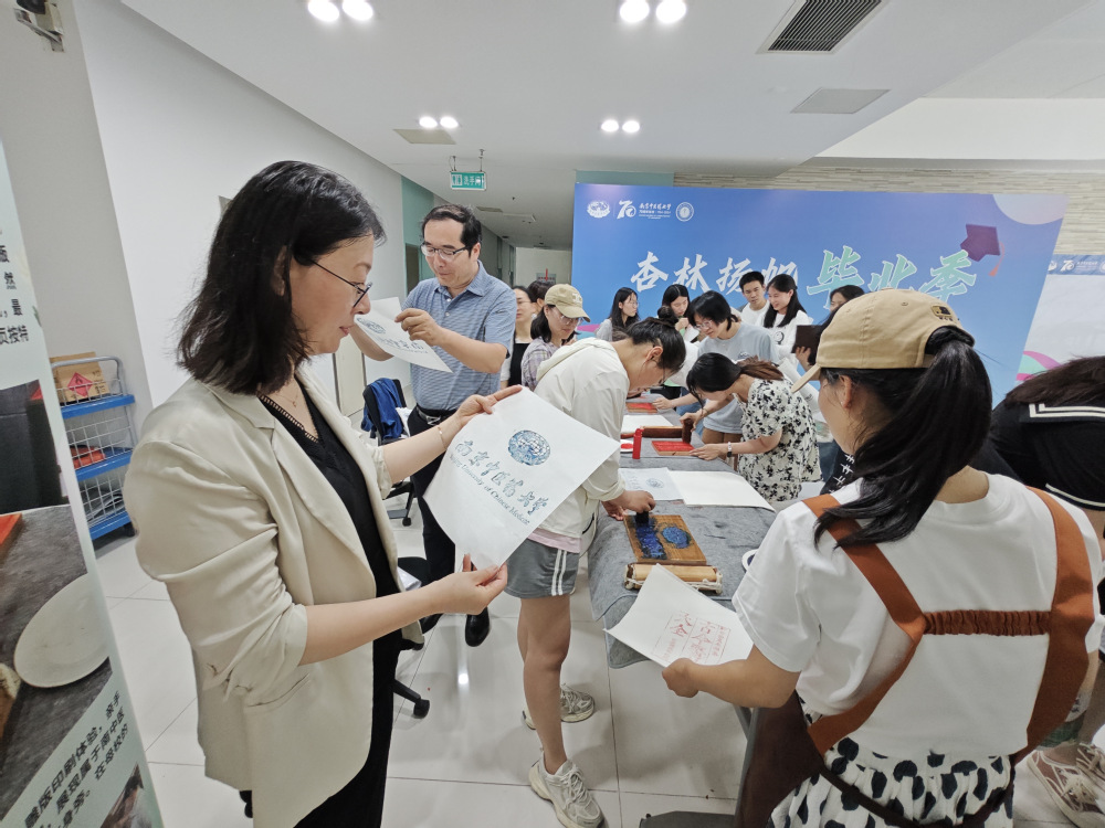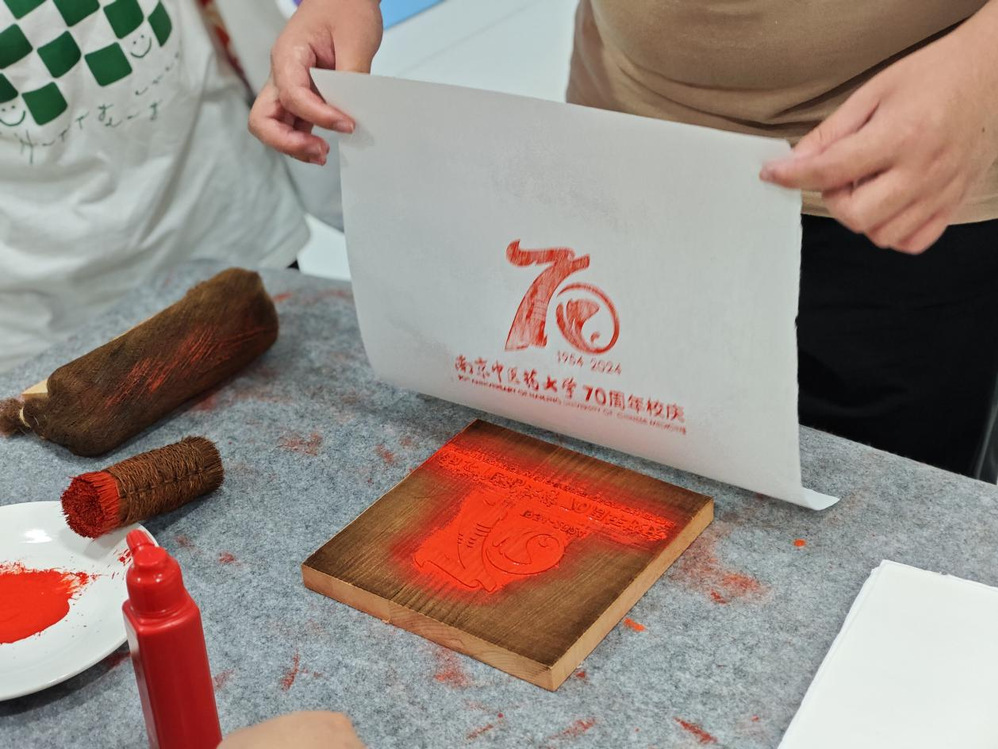 同时公司联合图书馆为毕业生提供纪念印章打卡、雕版印刷体验活动,活动现场设置了献礼校庆明信片留言板。毕业生在公司纪念本上印上南中医校徽、william威廉亚洲官方院徽、70周年校庆标识等印章,通过雕版印刷亲自体验印刷技术的魅力,印刷出南中医图标、中医经典书页等具有中医药文化特色的雕版画,在留言板上写下对母校70周年华诞的祝福,沉浸式参与让毕业生充分体会到浓浓母校情。