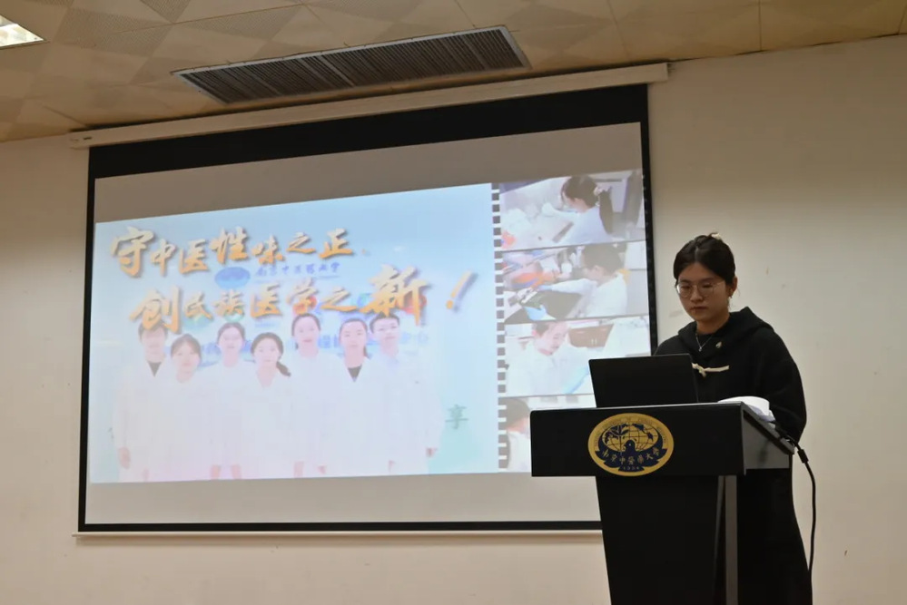 会议最后,第十八届“挑战杯”国赛特等奖项目主要团队成员岳启予同学进行项目展示,《基于苦味信号挖掘中药“苦能燥湿”药性理论内涵——以香连丸治疗溃疡性结肠炎为例》该项目通过结合中医“苦能燥湿”理论与现代生物学“苦味信号”概念,揭示了苦味药发挥燥湿作用的关键机制。还创新性地提出了“味-效-理”融合互证模式,为中医性味理论的现代科学解释和临床应用提供理论支持。通过该项目展示,鼓励同学们在导师的指导下,积极开展学术研究,推动中医药理论的创新与发展。