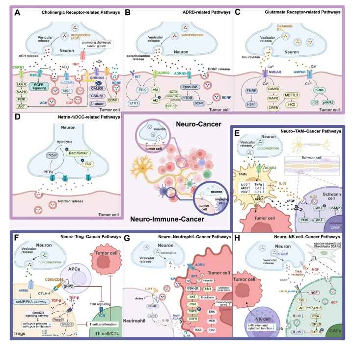 越来越多的研究表明,癌症和神经系统之间存在着双向作用关系。作者系统梳理了近十年来癌症-神经相互作用领域生物学机制的关键发现,首次从分子、细胞和系统层面整合了癌症与神经系统相互作用的关键机制。研究指出,肿瘤细胞通过分泌炎症因子等分子调控神经元活性,引发神经系统并发症;而神经细胞则通过递质释放和细胞间黏附直接干预肿瘤行为。此外,免疫系统作为“桥梁”介导了癌症与神经系统的间接对话。此外,作者还深入探讨了在癌症治疗背景下研究癌症-神经交互的临床意义:靶向神经系统抑制肿瘤生长和转移、通过神经调节重塑免疫系统用于癌症治疗、癌症神经生物学相关的非药物方法等(如具有中医特色的针灸疗法),为中西医结合学科在“神经-免疫-肿瘤”交互的理论创新和临床实践提供了参考。