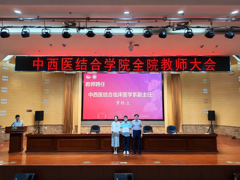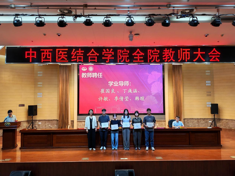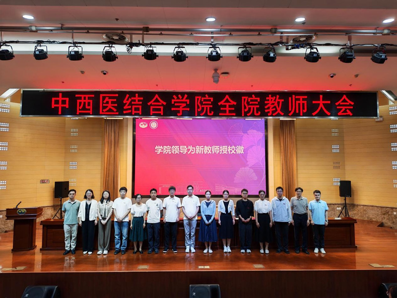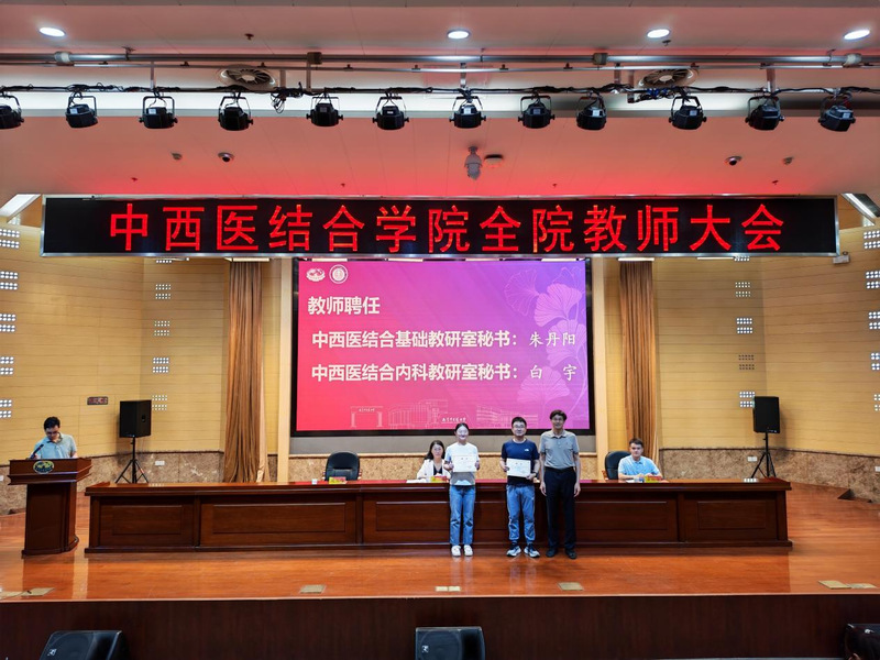 大会举行了学系、教研室及新生班级管理岗位聘任仪式。章轶立受聘为中西医结合临床医学系副主任,裴可受聘为循证与转化医学教研室副主任,朱丹阳、白宇分别受聘为中西医结合基础与内科教研室秘书。沃冠群、黄雯洁获聘2025级研究生班主任,崔国良、丁彧涵、许敏等受聘为2025级本科生学业指导老师。蒋燕书记和贾立军经理为受聘教师颁发聘书。公司领导还为杨道伟、王荣等新进教师佩戴校徽,标志着他们正式成为公司教师团队的一员。